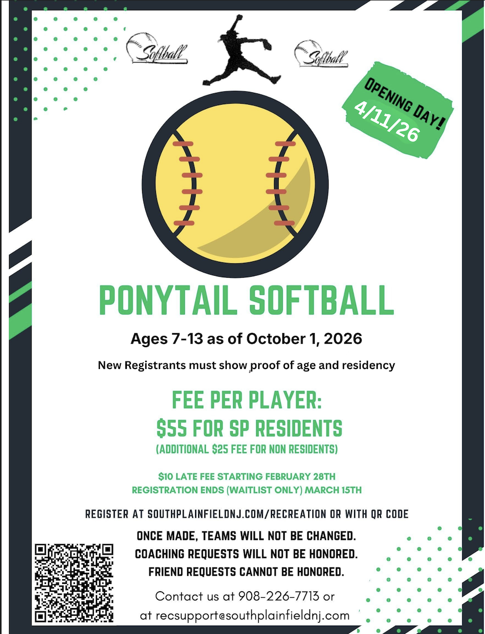 Get ready for an exciting 2026 season with South Plainfield Ponytail Softball! Designed for players ages 7–13, our program focuses on skill development, teamwork, confidence-building, and most importantly—fun. Opening Day is April 11, 2026, and we can’t wait to welcome new and returning athletes to the field. Registration is open now, with affordable pricing for residents and non-residents alike. Space is limited, so be sure to register early to avoid late fees and waitlist placement. Join us for a season filled with growth, sportsmanship, and unforgettable softball memories!